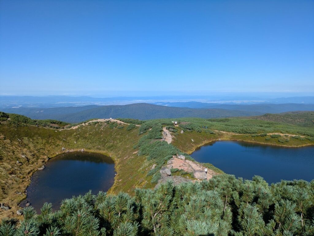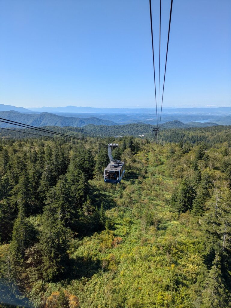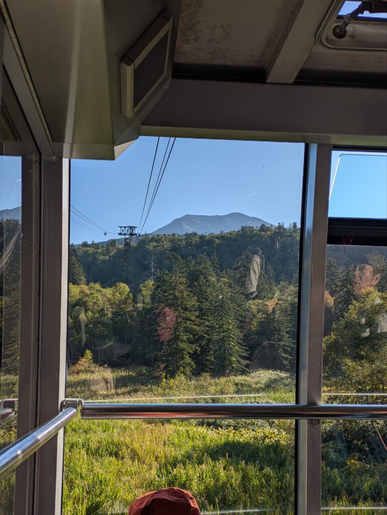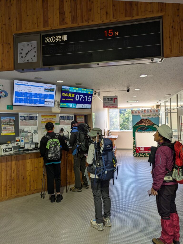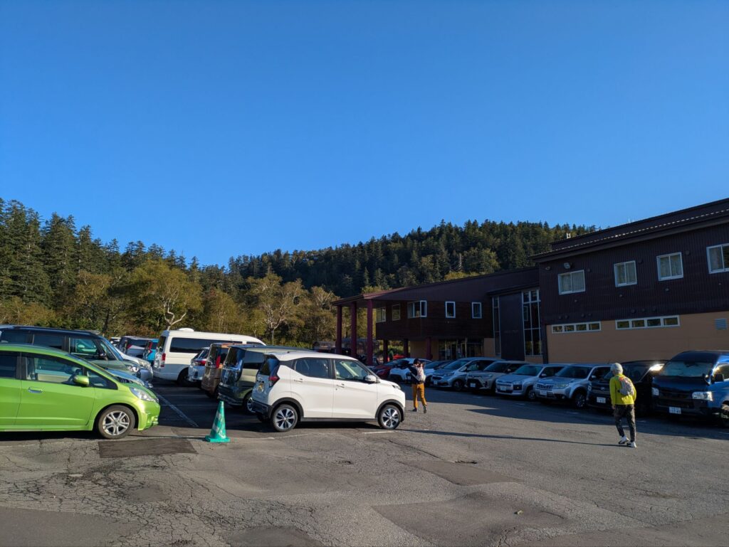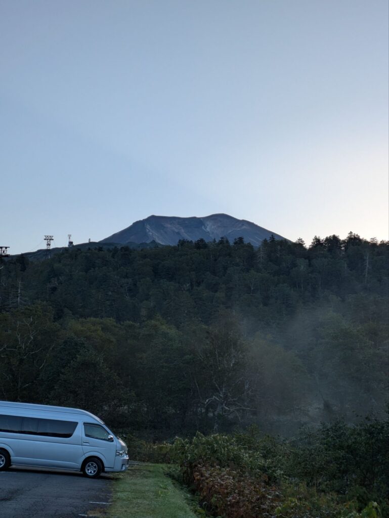 ハイキング当日は4時半過ぎに起き、遊水公園でトイレだけ済ませ、大雪旭岳源水に寄り洗顔とコーヒー用の水を頂き、旭岳ロープウェイ駐車場へ、同じ目的だろう早朝からガンガンとばし煽るような走り、気持ちは分かるが自然を楽しみに行く人間のやる事だろうかと首を傾げる。     予定通り早い人達は居るものの余裕でガラガラの駐車場に入り、去年と同じ場所を確保、後は始発に乗らなくてもいいので、車内でしっかり朝ご飯を食べ、持病の薬も飲んでハイキングの準備です。そんな準備を終えてさぁ〜ってところへTV朝日の羽鳥さんのモーニングショーの取材の方が訪れ、そこそこ長い取材を受けたがOAでは全カット、しかしハイキング中の家内が数秒だけ写ってました。